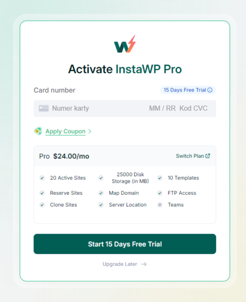 - Gdy pojawi się monit „Activate InstaWP Pro” kliknij „Upgrade Later ->”.