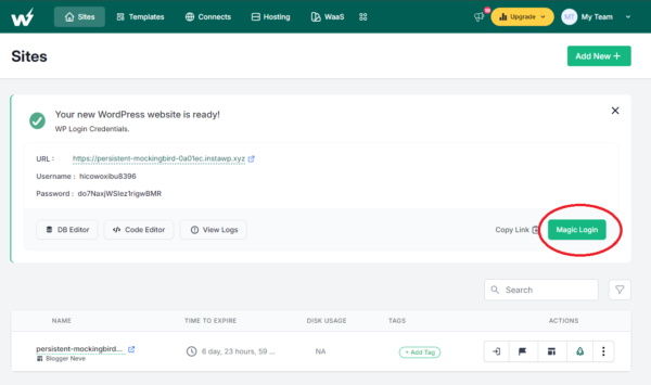 Następnie kliknij przycisk „Magic Login” aby zalogować się do zaplecza twoje instalacji WordPress-a