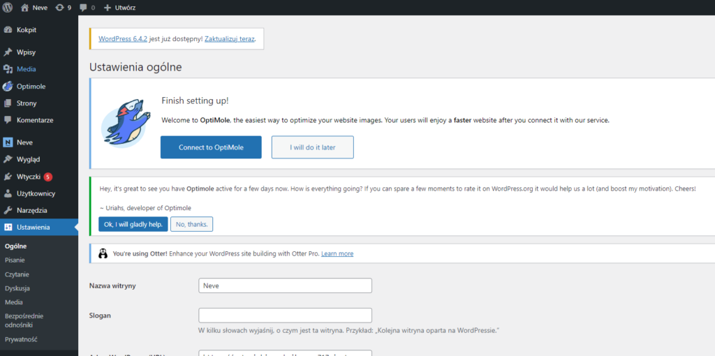 Po zalogowaniu do pulpitu administratora warto przejrzeć podstawowe ustawienia strony. Można to zrobić, klikając w menu po lewej stronie na pozycję Ustawienia.