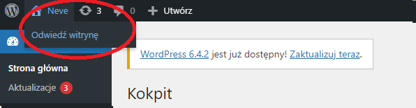 Jeżeli chcemy przejść do widoku witryny to klikamy w lewym górnym rogu na nazwę naszej strony.