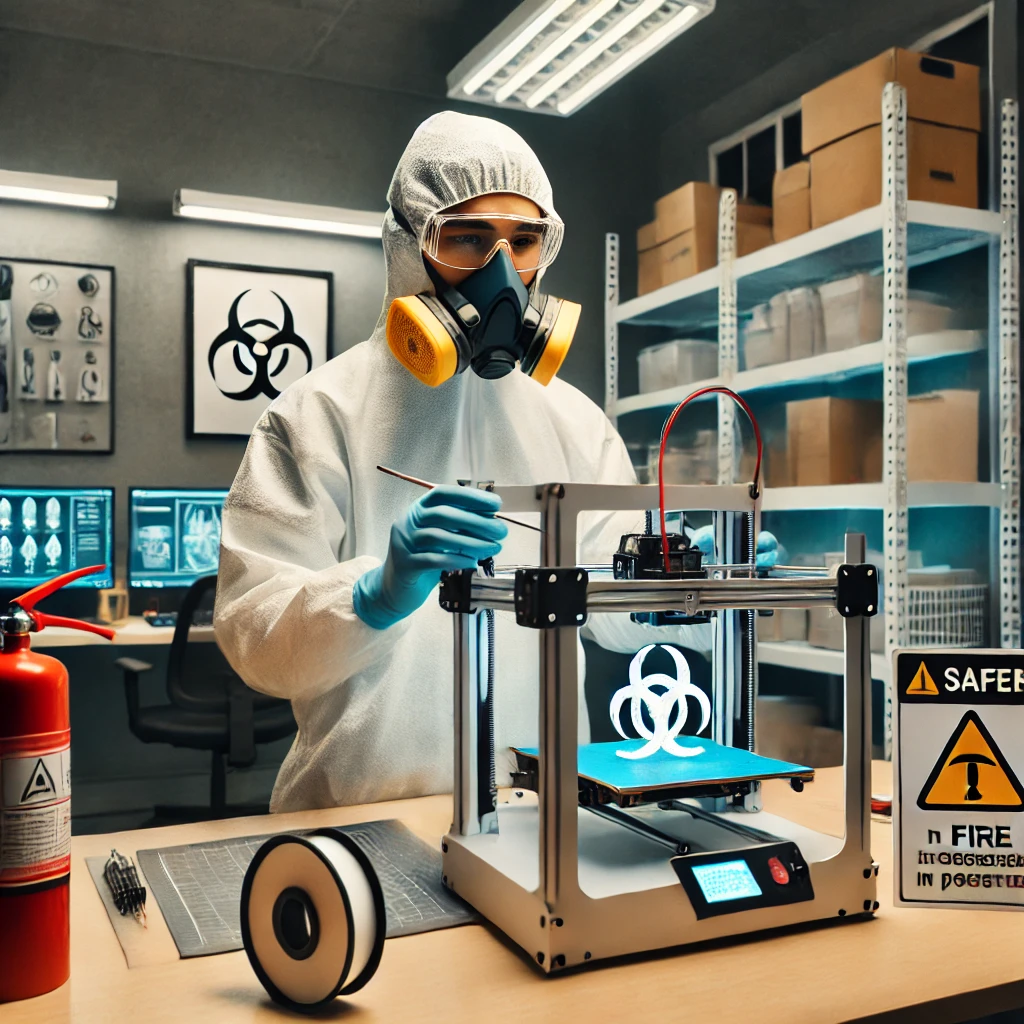 Praca z drukarką 3D FDM wymaga noszenia odpowiedniego sprzętu ochrony osobistej (PPE), aby zapobiec narażeniu operatora na urazy czy kontakt z szkodliwymi substancjami: