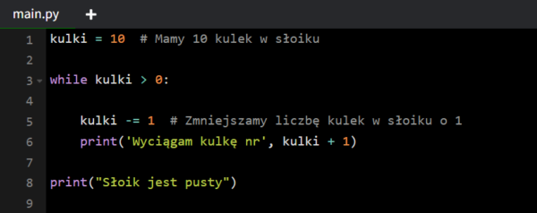W tym przykładzie pętla while działa, dopóki liczba kulek jest większa od zera. Kiedy kulki stanie się równe 0, pętla przestaje działać, a program wyświetla informację, że słoik jest pusty.