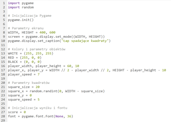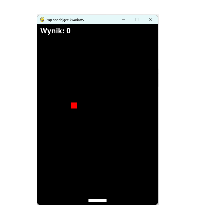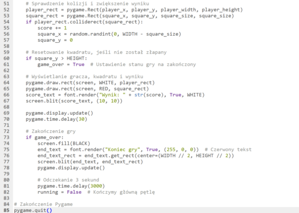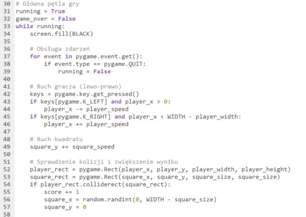 import pygame– Importuje bibliotekę Pygame, umożliwiającą tworzenie grafiki, obsługę dźwięku i interakcji.import random– Importuje modułrandom, który pozwala generować losowe liczby, przydatne do ustawiania pozycji kwadratu.pygame.init()– Inicjalizuje wszystkie moduły Pygame, przygotowując je do użycia.WIDTH, HEIGHT = 400, 600– Ustawia szerokość (WIDTH) i wysokość (HEIGHT) okna gry na 400 x 600 pikseli.screen = pygame.display.set_mode((WIDTH, HEIGHT))– Tworzy okno gry o wymiarachWIDTHxHEIGHT, w którym będą wyświetlane wszystkie elementy gry.pygame.display.set_caption("Łap spadające kwadraty")– Ustawia tytuł okna gry na „Łap spadające kwadraty”, widoczny na pasku okna.WHITE = (255, 255, 255)– Definiuje kolor biały w formacie RGB, używany do rysowania tekstu i gracza.RED = (255, 0, 0)– Definiuje kolor czerwony w formacie RGB, który będzie używany do rysowania spadającego kwadratu.BLACK = (0, 0, 0)– Definiuje kolor czarny w formacie RGB, który będzie tłem gry.player_width, player_height = 60, 10– Określa szerokość (60 pikseli) i wysokość (10 pikseli) gracza.player_x, player_y = WIDTH // 2 - player_width // 2, HEIGHT - player_height - 10– Ustawia początkową pozycję gracza pośrodku dolnej krawędzi ekranu.player_speed = 7– Definiuje prędkość poruszania się gracza w pikselach na klatkę.square_size = 20– Ustawia rozmiar spadającego kwadratu na 20 pikseli (szerokość i wysokość).square_x = random.randint(0, WIDTH - square_size)– Losuje pozycję X kwadratu, tak aby zaczynał w losowym miejscu w poziomie.square_y = 0– Ustawia początkową pozycję Y kwadratu na górze ekranu.square_speed = 5– Definiuje prędkość spadania kwadratu, który przesuwa się w dół o 5 pikseli na klatkę.score = 0– Inicjalizuje wynik gracza na 0, który będzie zwiększany, gdy gracz złapie kwadrat.font = pygame.font.Font(None, 36)– Ustawia czcionkę i jej rozmiar na 36 punktów do wyświetlania wyniku i komunikatów.running = True– Flagarunningustawiona naTrueumożliwia działanie głównej pętli gry.game_over = False– Flagagame_overustawiona naFalse, informuje, że gra nie jest jeszcze zakończona.while running:– Rozpoczyna główną pętlę gry, która będzie działała dopókirunningpozostanieTrue.screen.fill(BLACK)– Wypełnia cały ekran kolorem czarnym, co resetuje tło przed każdym rysowaniem, aby nie było śladów poprzednich klatek.for event in pygame.event.get():– Przechwytuje wszystkie zdarzenia, które miały miejsce od ostatniej klatki (np. kliknięcie przycisku, ruch myszy).if event.type == pygame.QUIT:– Sprawdza, czy zdarzenie to zamknięcie okna gry przez użytkownika.running = False– UstawiarunningnaFalse, co kończy pętlę gry, jeśli użytkownik zamknął okno.keys = pygame.key.get_pressed()– Pobiera stan wszystkich klawiszy na klawiaturze, aby można było sprawdzić, które są aktualnie wciśnięte.if keys[pygame.K_LEFT] and player_x > 0:– Sprawdza, czy wciśnięto klawisz strzałki w lewo i czy gracz nie wyjdzie poza lewą krawędź ekranu.player_x -= player_speed– Przesuwa gracza w lewo o wartośćplayer_speed, jeśli strzałka w lewo jest wciśnięta.if keys[pygame.K_RIGHT] and player_x < WIDTH - player_width:– Sprawdza, czy wciśnięto strzałkę w prawo i czy gracz nie wyjdzie poza prawą krawędź ekranu.player_x += player_speed– Przesuwa gracza w prawo o wartośćplayer_speed, jeśli strzałka w prawo jest wciśnięta.square_y += square_speed– Przesuwa kwadrat w dół o wartośćsquare_speed, symulując spadanie.player_rect = pygame.Rect(player_x, player_y, player_width, player_height)– Tworzy prostokąt reprezentujący gracza, co ułatwia późniejsze sprawdzenie kolizji.square_rect = pygame.Rect(square_x, square_y, square_size, square_size)– Tworzy prostokąt reprezentujący spadający kwadrat.if player_rect.colliderect(square_rect):– Sprawdza, czy prostokąt gracza koliduje z prostokątem kwadratu, czyli czy kwadrat został złapany.score += 1– Jeśli nastąpi kolizja, zwiększa wynik o 1.square_x = random.randint(0, WIDTH - square_size)– Resetuje pozycję X kwadratu na losową wartość, aby pojawił się w innym miejscu po złapaniu.square_y = 0– Resetuje pozycję Y kwadratu na górze ekranu, aby zaczynał spadać od nowa.if square_y > HEIGHT:– Sprawdza, czy kwadrat spadł poniżej dolnej krawędzi ekranu, czyli gracz go nie złapał.game_over = True– Jeśli kwadrat spadł poza ekran, ustawiagame_overnaTrue, kończąc grę.pygame.draw.rect(screen, WHITE, player_rect)– Rysuje prostokąt gracza na ekranie w miejscu określonym przezplayer_rect.pygame.draw.rect(screen, RED, square_rect)– Rysuje prostokąt spadającego kwadratu w miejscu określonym przezsquare_rect.score_text = font.render("Wynik: " + str(score), True, WHITE)– Renderuje tekst z wynikiem jako obraz, który można wyświetlić na ekranie.screen.blit(score_text, (10, 10))– Wyświetla wynik w lewym górnym rogu ekranu, przesuwając obraz wyniku o 10 pikseli od krawędzi.pygame.display.update()– Aktualizuje ekran, aby wyświetlić nową klatkę z elementami gry. Bez tej linii widoczne byłyby tylko wcześniejsze zmiany.pygame.time.delay(30)– Wstrzymuje wykonanie kolejnej iteracji pętli o 30 ms, aby spowolnić grę i uczynić ją płynniejszą.if game_over:– Sprawdza, czy gra się zakończyła (np. kwadrat spadł bez złapania).screen.fill(BLACK)– Wypełnia ekran kolorem czarnym, aby wyczyścić go przed wyświetleniem końcowego komunikatu.end_text = font.render("Koniec gry", True, (255, 0, 0))– Renderuje tekst „Koniec gry” na czerwono jako obraz.end_text_rect = end_text.get_rect(center=(WIDTH // 2, HEIGHT // 2))– Ustawia pozycję końcowego tekstu na środku ekranu.screen.blit(end_text, end_text_rect)– Wyświetla komunikat „Koniec gry” na ekranie w położeniu ustalonym przezend_text_rect.pygame.display.update()– Aktualizuje ekran, aby wyświetlić koń