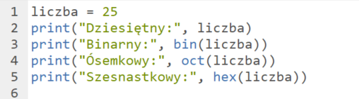 oct(liczba)– konwertuje liczbę dziesiętną na ósemkową. - Szesnastkowy: