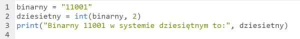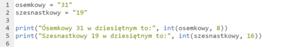 Aby skonwertować liczbę z innego systemu liczbowego na dziesiętny, używamy funkcji int(liczba, podstawa), gdzie podstawa określa system liczbowy, z którego konwertujemy.