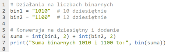 Python pozwala na wykonywanie operacji matematycznych na liczbach, niezależnie od systemu liczbowego, w którym są przedstawione. Po konwersji do dziesiętnego możemy dodawać, odejmować, mnożyć i dzielić liczby. Następnie wynik można przekonwertować na dowolny inny system liczbowy.