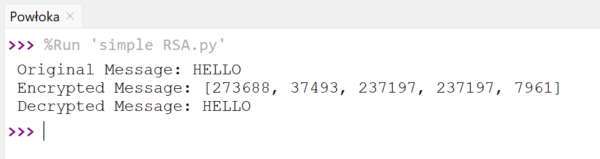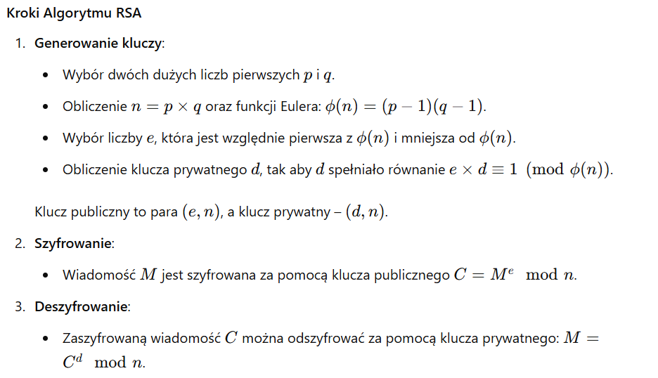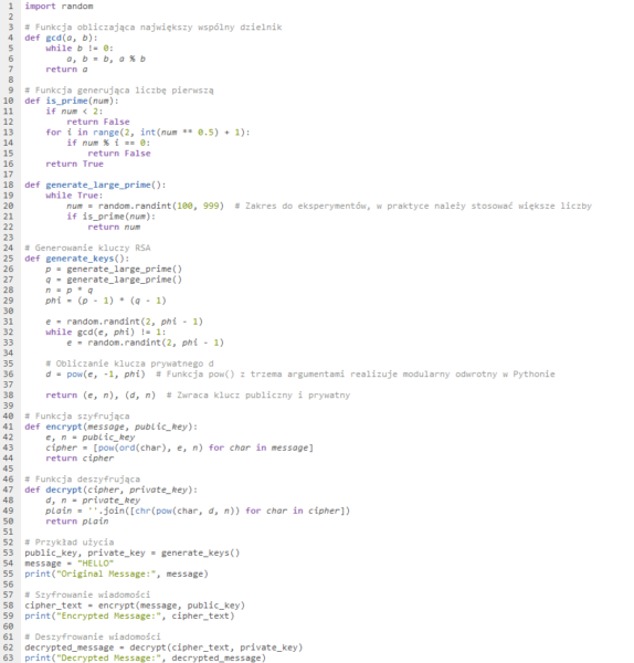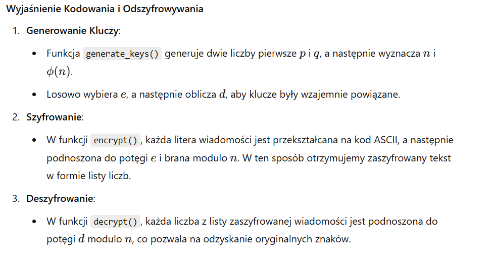 Uwaga: Ze względu na przejrzystość przykładów, liczby pierwsze generowane przez generate_large_prime() są małe. W praktycznych zastosowaniach zaleca się użycie dużych liczb pierwszych dla większego bezpieczeństwa.