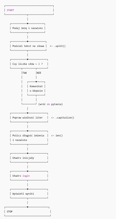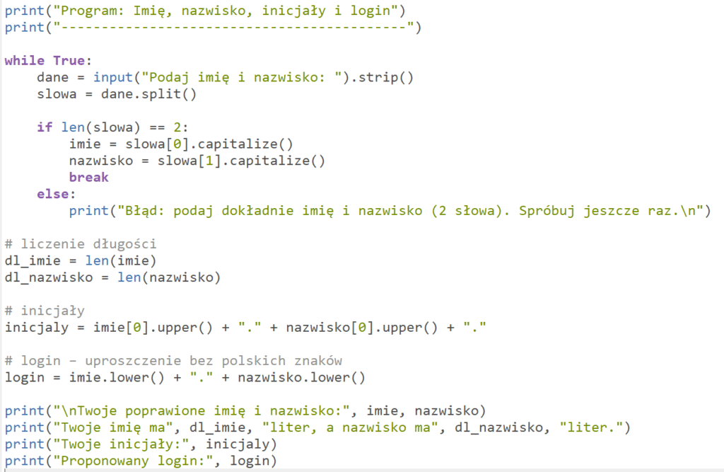 Sprawdzi, czy użytkownik wprowadził dokładnie dwa słowa (imie i nazwisko). Jeśli nie — wypisze komunikat o błędzie i poprosi ponownie.