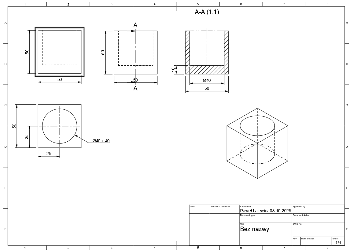 Przedmiot rysunku: Narysuj w rzutach prostokątnych i w przekroju prostą bryłę – sześcian o boku 50 mm z okrągłym, przelotowym otworem na wylot, przechodzącym przez środek każdej ściany. Średnica otworu wynosi 40 mm.