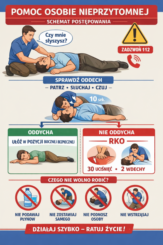 Utrata przytomności to stan zagrożenia zdrowia, a niekiedy także życia człowieka. Osoba nieprzytomna nie reaguje na bodźce zewnętrzne, nie odpowiada na pytania i nie kontroluje własnego ciała. Prawidłowa i szybka reakcja świadka zdarzenia może uratować życie poszkodowanemu. Dlatego znajomość zasad udzielania pierwszej pomocy osobie nieprzytomnej jest jednym z podstawowych elementów edukacji dla bezpieczeństwa.