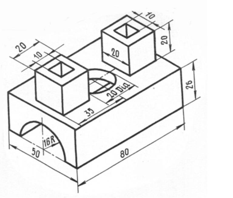 Na podstawie poniższego rzutu izometrycznego z wymiarami wykonaj model 3D oraz rysunek techniczny.