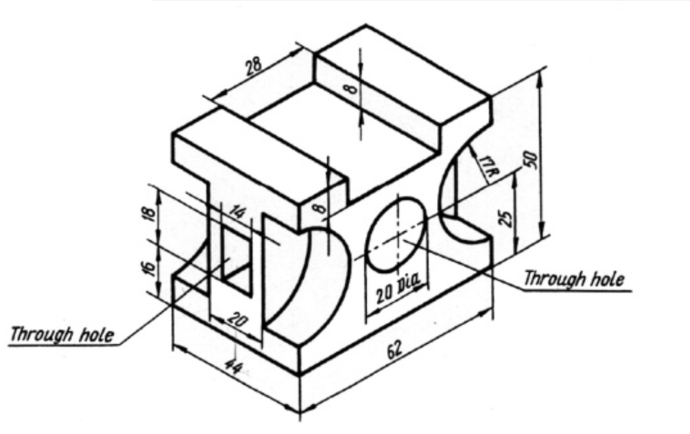 Na podstawie poniższego rzutu izometrycznego z wymiarami wykonaj model 3D oraz rysunek techniczny.