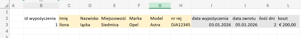 W arkuszu „wyszukiwanie” uzupełnij dane dotyczące wypożyczenia na podstawie ID wypożyczenia, korzystając z danych zapisanych w pozostałych arkuszach.