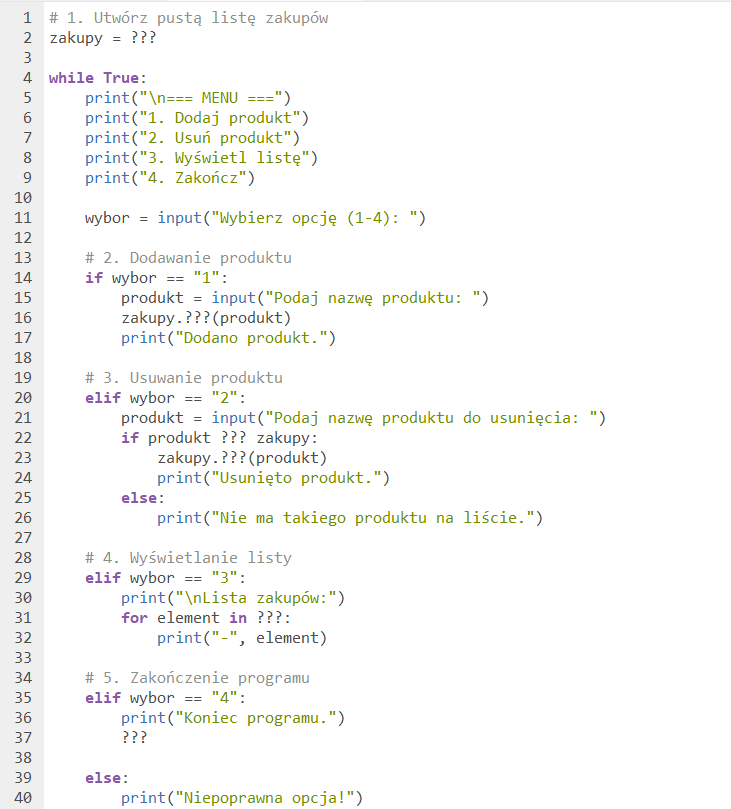 Ćwiczenie – Interaktywna lista zakupów (kod do uzupełnienia)