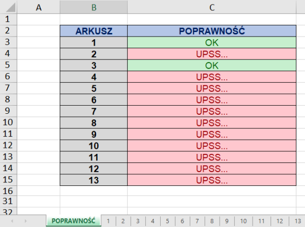 Część trzecia zadań do samodzielnego rozwiązania i sprawdzenia swoich wiadomości i umiejętności. Poniżej znajduje się link z plikiem z zadaniami. Plik w arkuszu POPRAWNOŚĆ wyświetla czy zadanie zostało zrobione prawidłowo czy też nie.