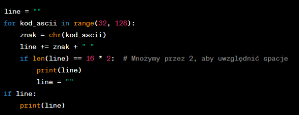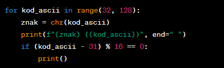 Ten kod generuje kody ASCII od 32 do 127, konwertuje je na znaki i wyświetla znak oraz odpowiedni kod ASCII. Używamy end=" " w funkcji print(), aby uniknąć przechodzenia do nowej linii po każdym znaku, a następnie sprawdzamy, czy liczba znaków w linii przekroczyła 16 (od 1 do 16) przy użyciu (kod_ascii - 31) % 16. Jeśli tak, to przechodzimy do nowej linii, co tworzy linię po 16 znaków w konsoli.