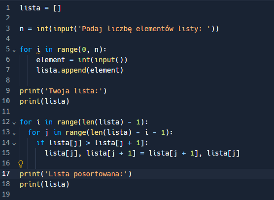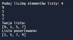 Sortowanie w języku Python można też realizować za pomocą metody sort(): https://www.w3schools.com/python/ref_list_sort.asp