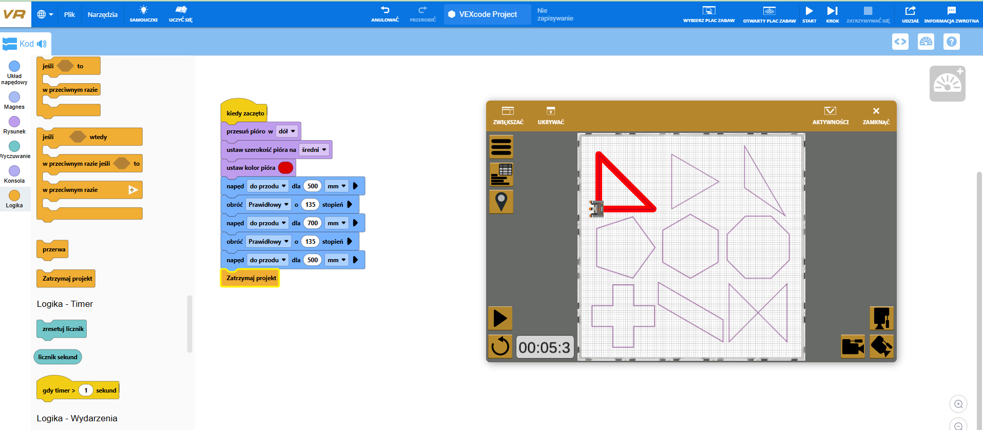 robotem VEX. Uczeń będzie obrysowywać różne figury geometryczne,