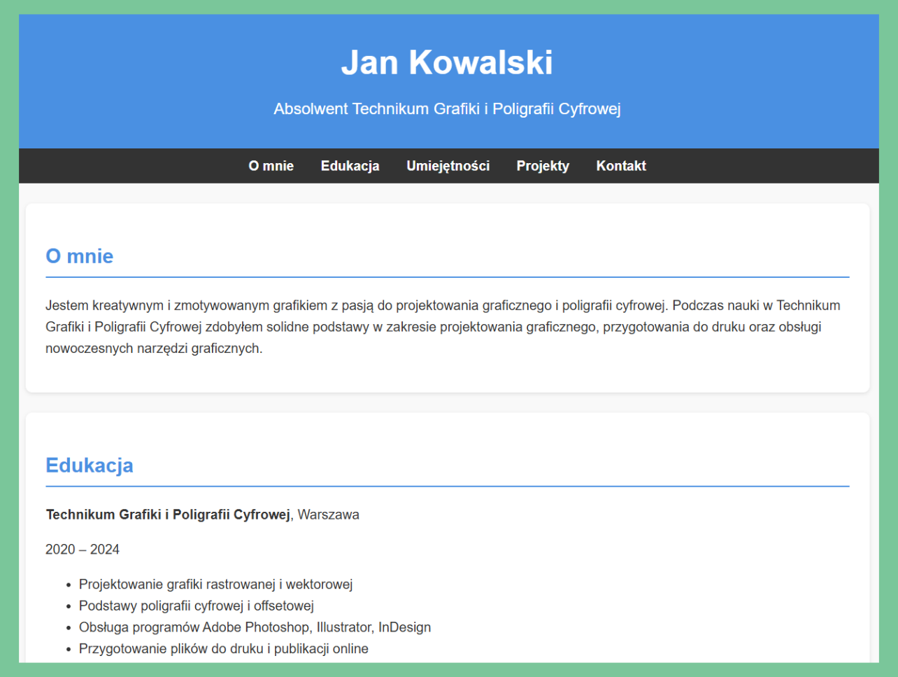 Twoim zadaniem jest stworzenie własnego portfolio online, prezentującego Twoje najlepsze prace z całego okresu nauki w technikum (do 5 lat).